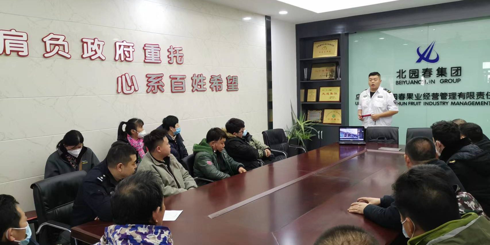 2023年2月27日下午4点,西山派出所民警李广森、西山片区管委会安监站站长温淳,西山市场监督管理所所长柳狄,永平巷社区主任苏凯等组织北园春果业公司部分经营纸品、易燃品的商户和安全管理人员进行消防安全及安全生产教育培训。